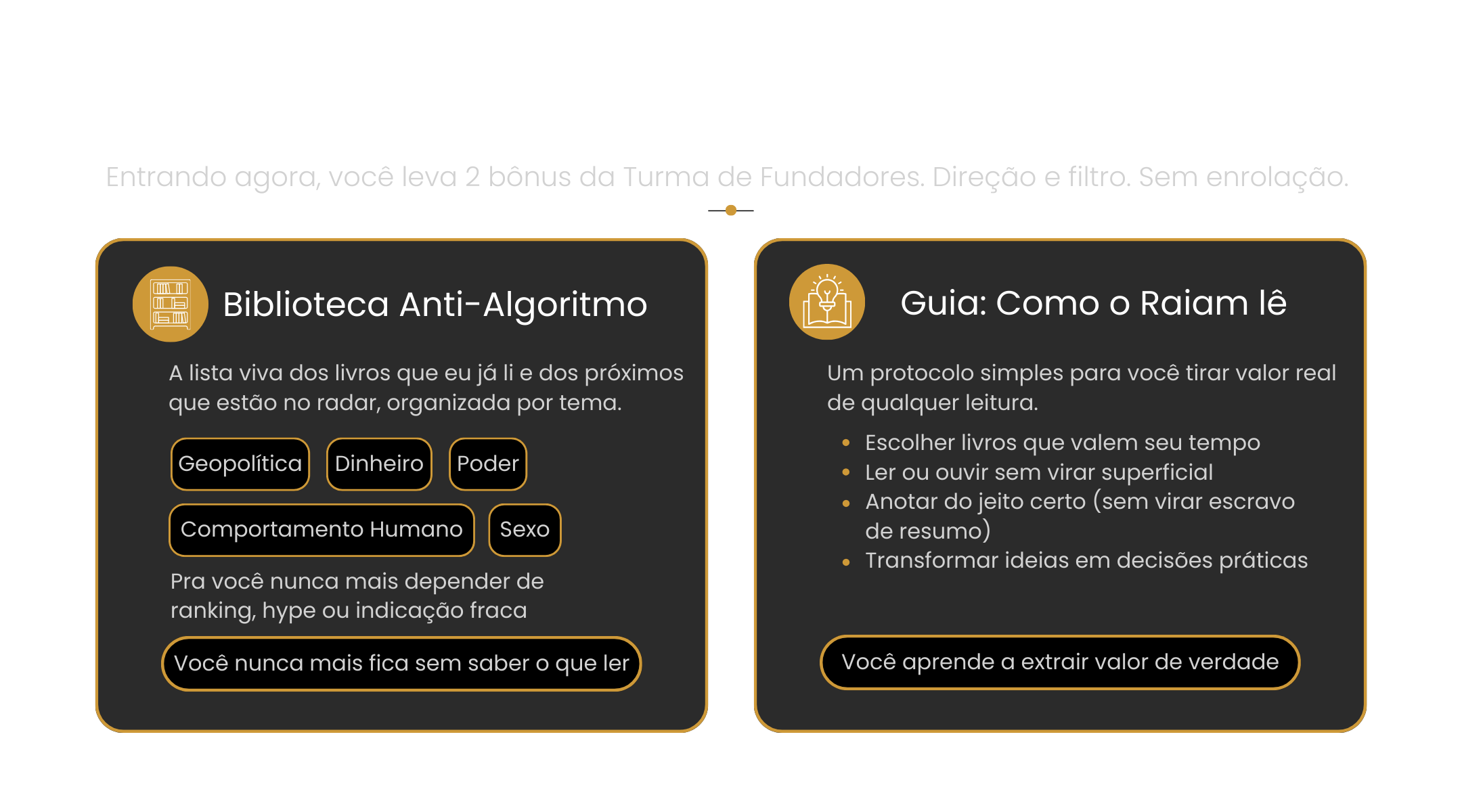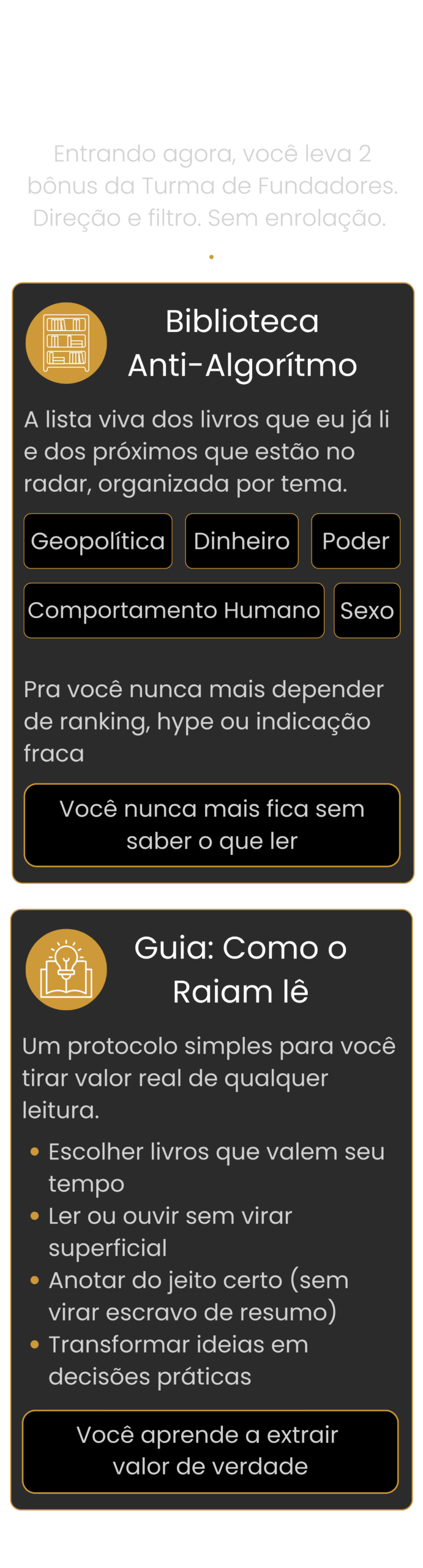 Se você não lê quase nada, você precisa de direção e ambiente, não de mais “dica”. Eu te mostro o livro certo, te guio no que observar e você entra numa comunidade que puxa sua régua pra cima e te ajuda a ser consistente na leitura.